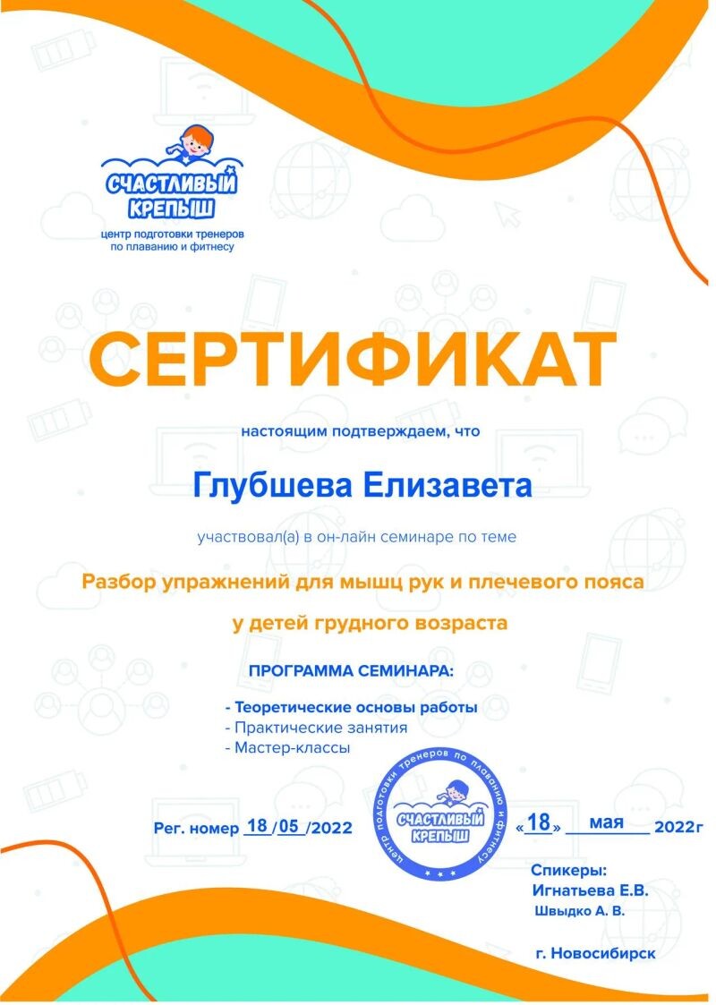 - Центр подготовки тренеров по плаванию и фитнесу «Счастливый крепыш», семинар «Разбор упражнений для мышц рук и плечевого пояса у детей грудного возраста», 2022 г.