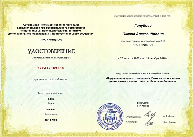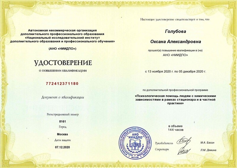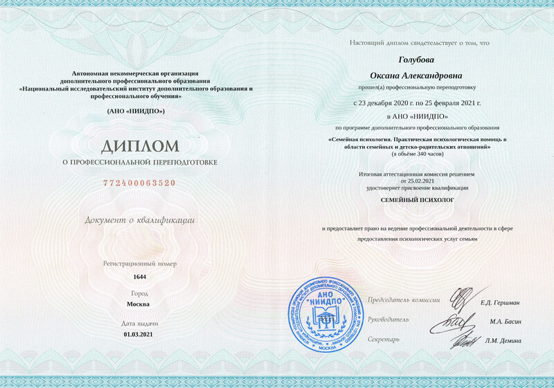 - НИИДПО, «Семейная психология. Практическая психологическая помощь в области семейных и детско-родительских отношений», 2020–2021 гг.