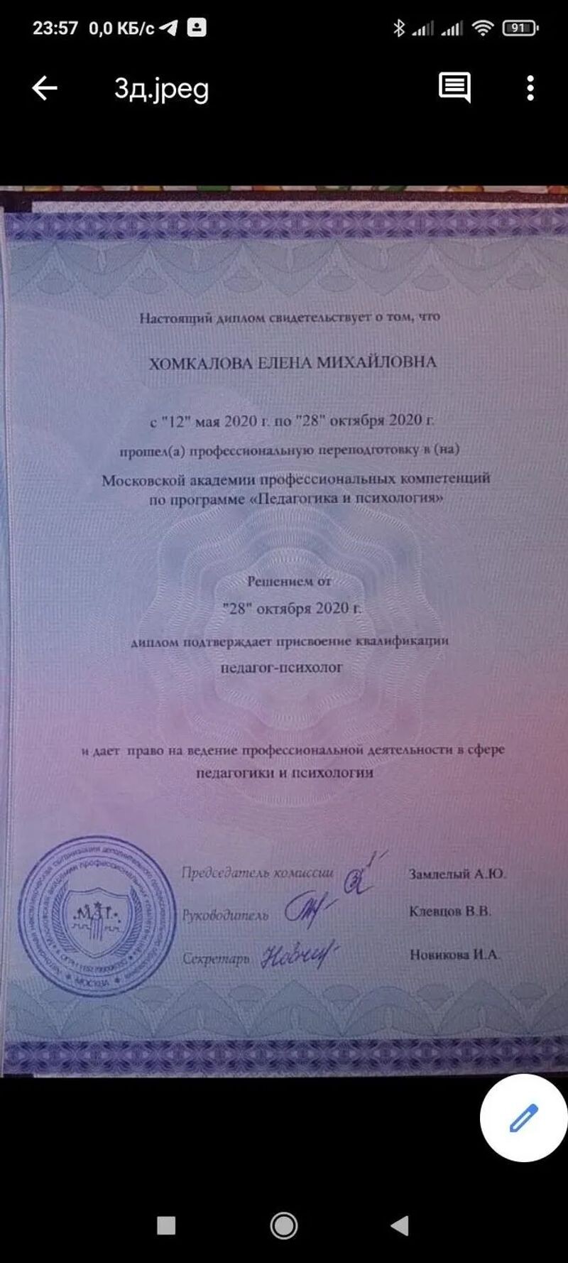 - Московская академия профессиональных компетенций, педагогика и психология, педагог-психолог, 2020 г.