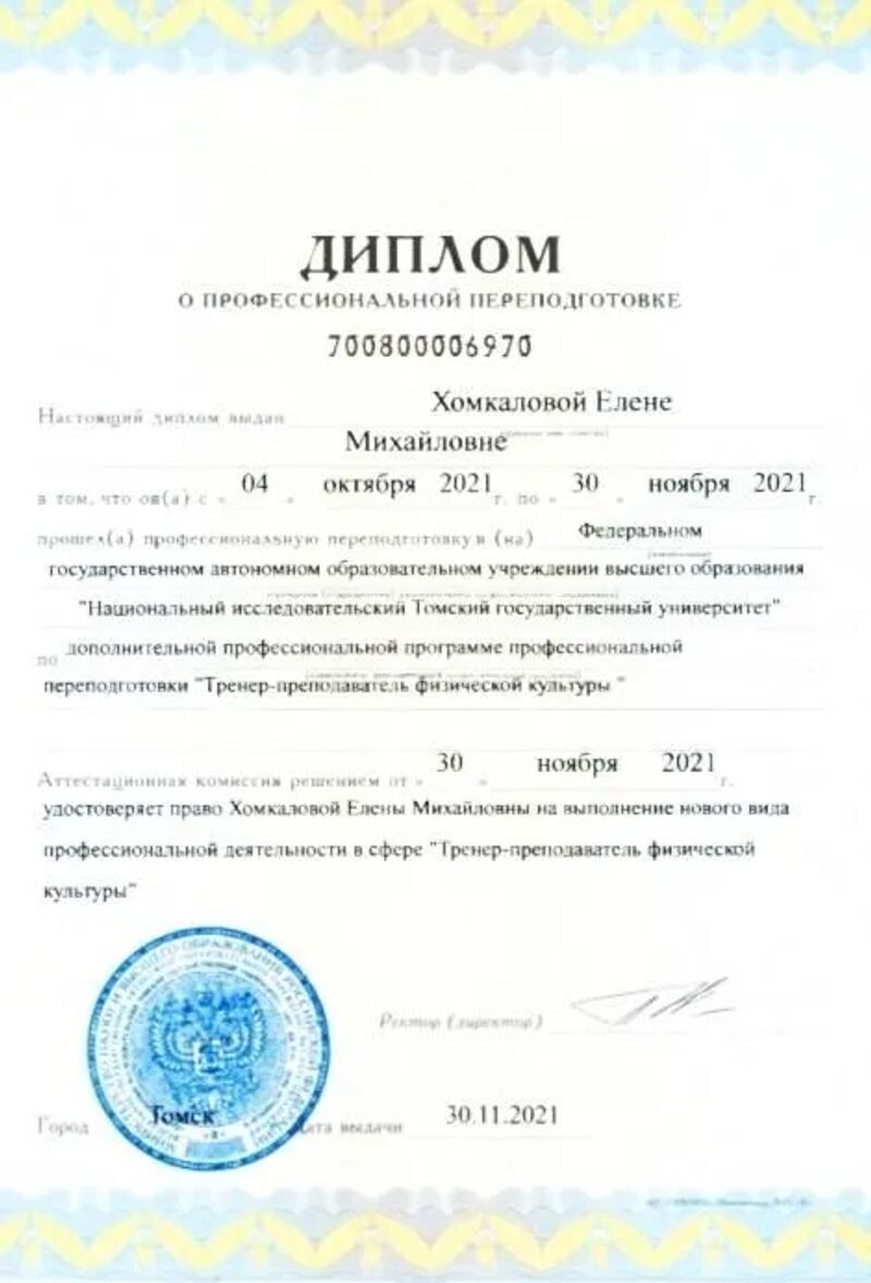 - Национальный исследовательский Томский государственный университет, тренер-преподаватель по физической культуре, 2021 г.