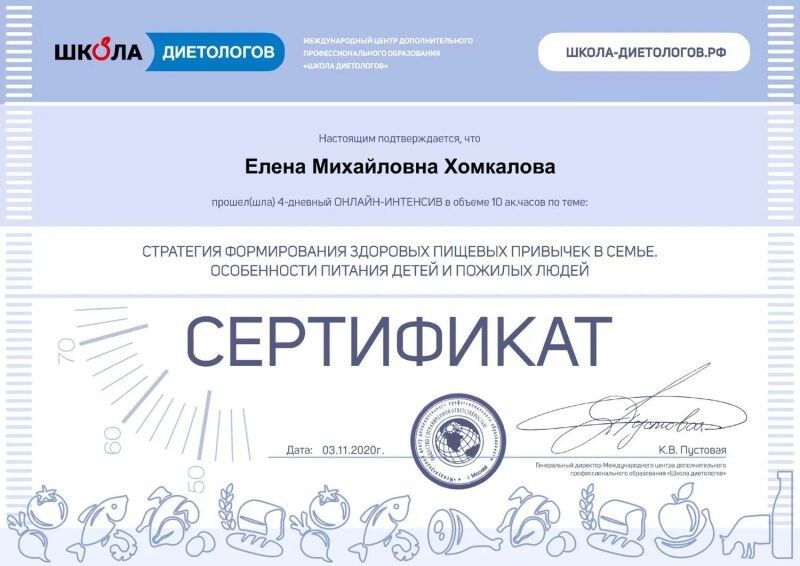- Школа диетологов, онлайн-интенсив «Стратегия формирования здоровых пищевых привычек в семье. Особенности питания детей и пожилых людей.», 2020 г.