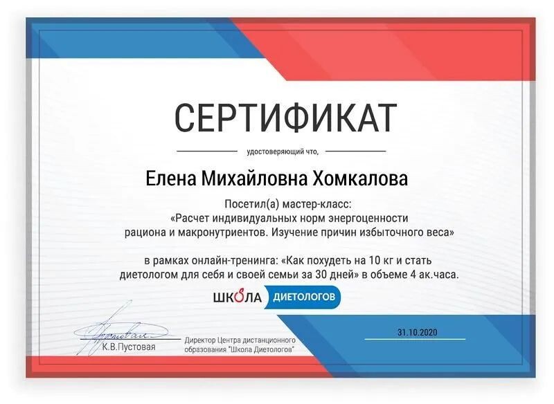 - Школа диетологов, мастер-класс «Расчёт индивидуальных норм энергоценности рациона и макронутриентов. Изучение причин избыточного веса», 2020 г.