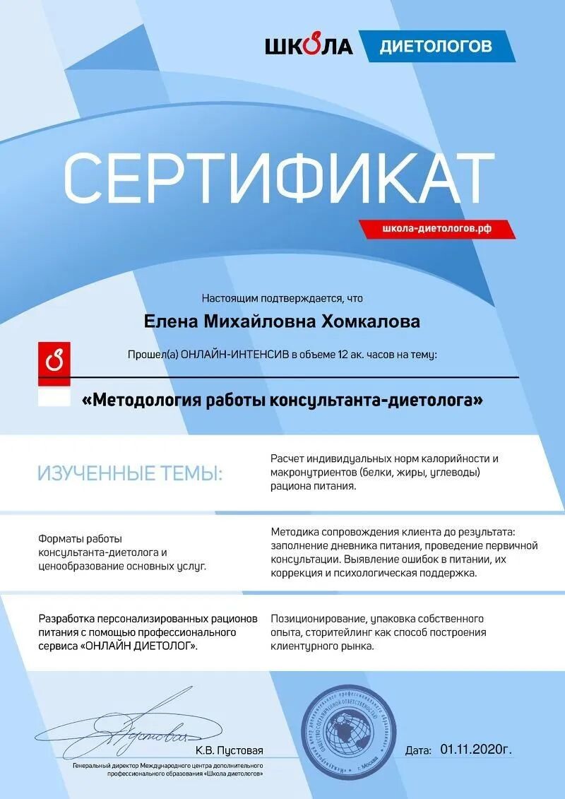 - Школа диетологов, онлайн-интенсив «Методология работы консультанта-диетолога», 2020 г.