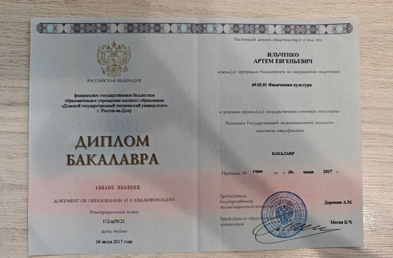 - Окончил Институт физической культуры и спорта Донского государственного технического университета в 2017 году. Присвоена квалификация "Бакалавр".
