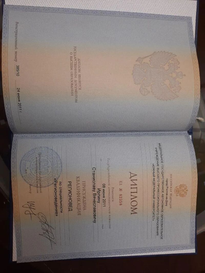 - Ростовский государственный университет, специальность — регионоведение, специализация «Региональные социально-политические коммуникации», 2006–2011 гг.
