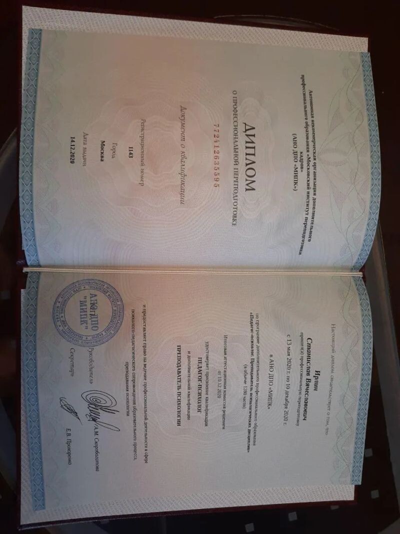 - АНО ДПО «МИПК», программа «Педагог-психолог. Преподаватель психологических дисциплин», преподаватель психологии, педагог-психолог, 2020 г.