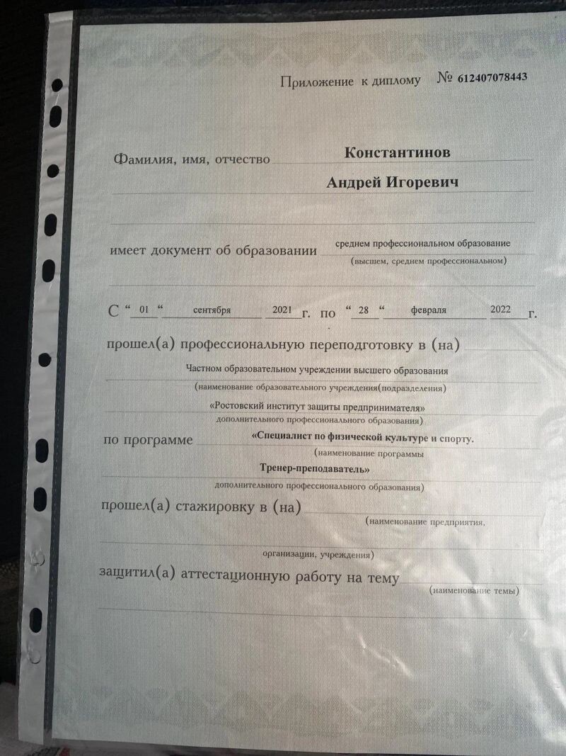 - Ростовский институт защиты предпринимателя, специальность – специалист по физической культуре и спорту, тренер-преподаватель, 2021–2022 гг.