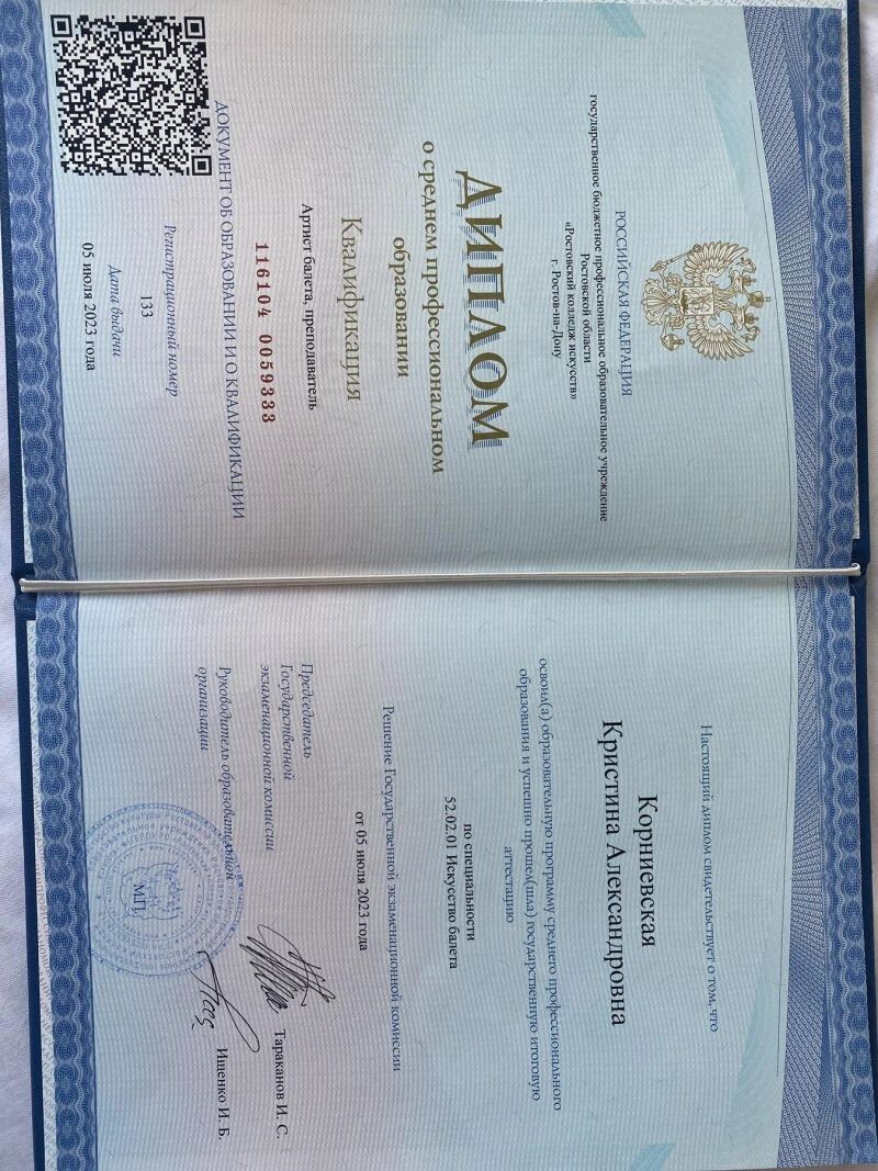 - Ростовский колледж искусств, искусство балета, 2016–2023 гг.