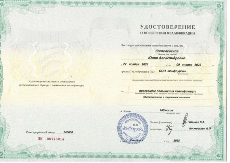 - Повышение квалификации «Нутрициология и спортивное питание « (с 2025 г.).
