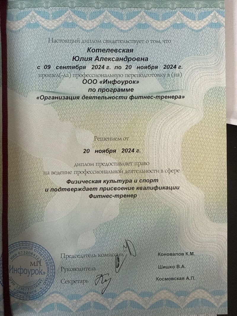 - ООО «Инфоурок», программа «Организация деятельности фитнес-тренера», 2024 г.