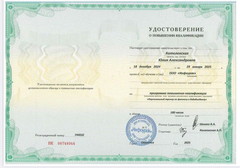 - Повышение квалификации «Персональный тренер по фитнесу и бодибилдингу» (с 2025 г.).