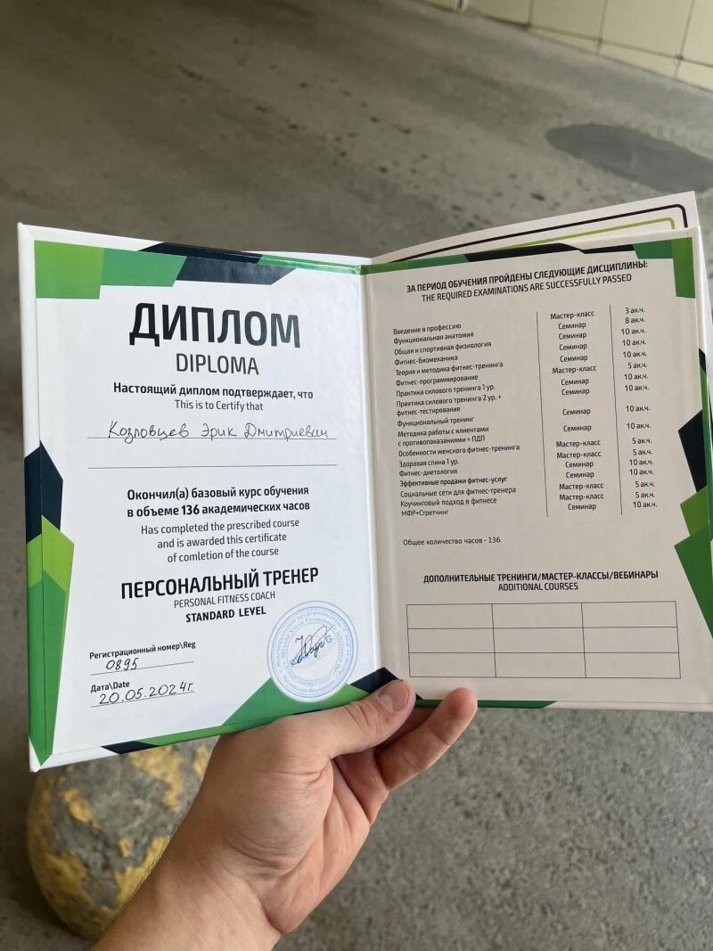 - Фитнес-школа PRO-FG, курс «Персональный тренер», 2023–2024 гг.