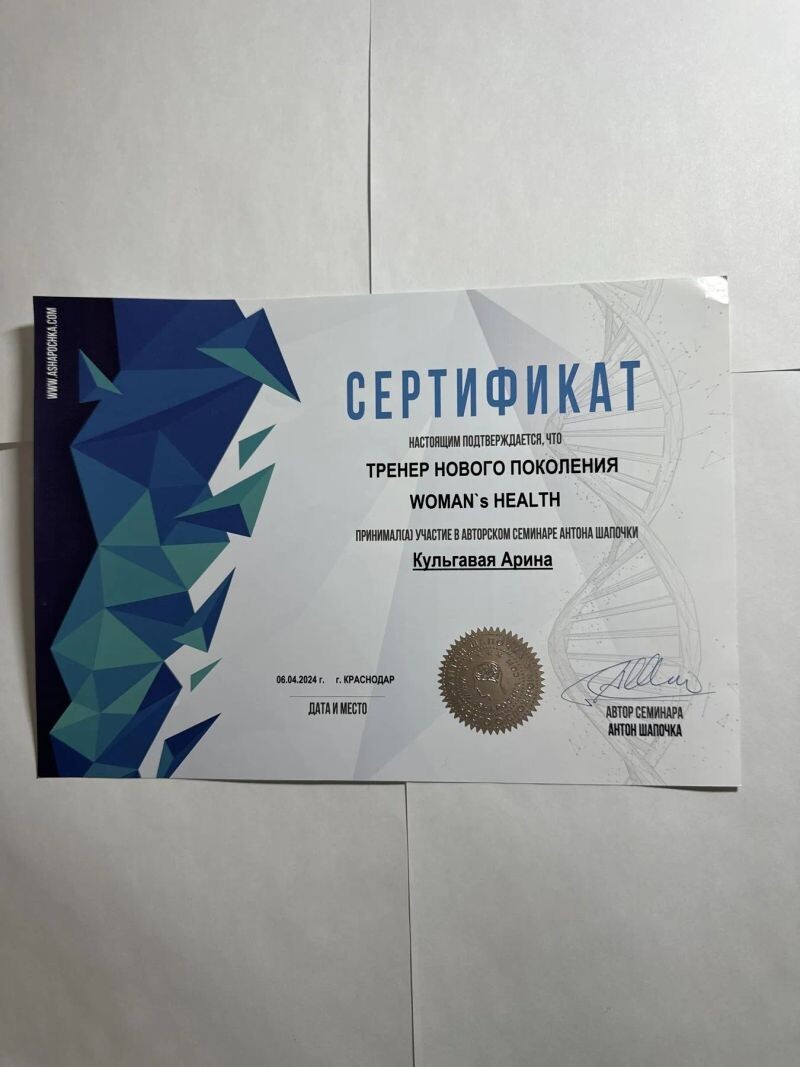 - Сертификат семинара Антона Шапочки «тренер нового поколения WOMEN’S HEALTH” (с 2024 г.).
