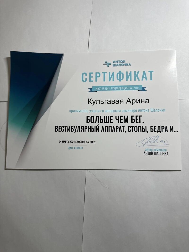 - Сертификат семинара Антона Шапочки «Больше чем бег. Вестибулярный аппарат, стопы, бедра и..» (с 2024 г.).