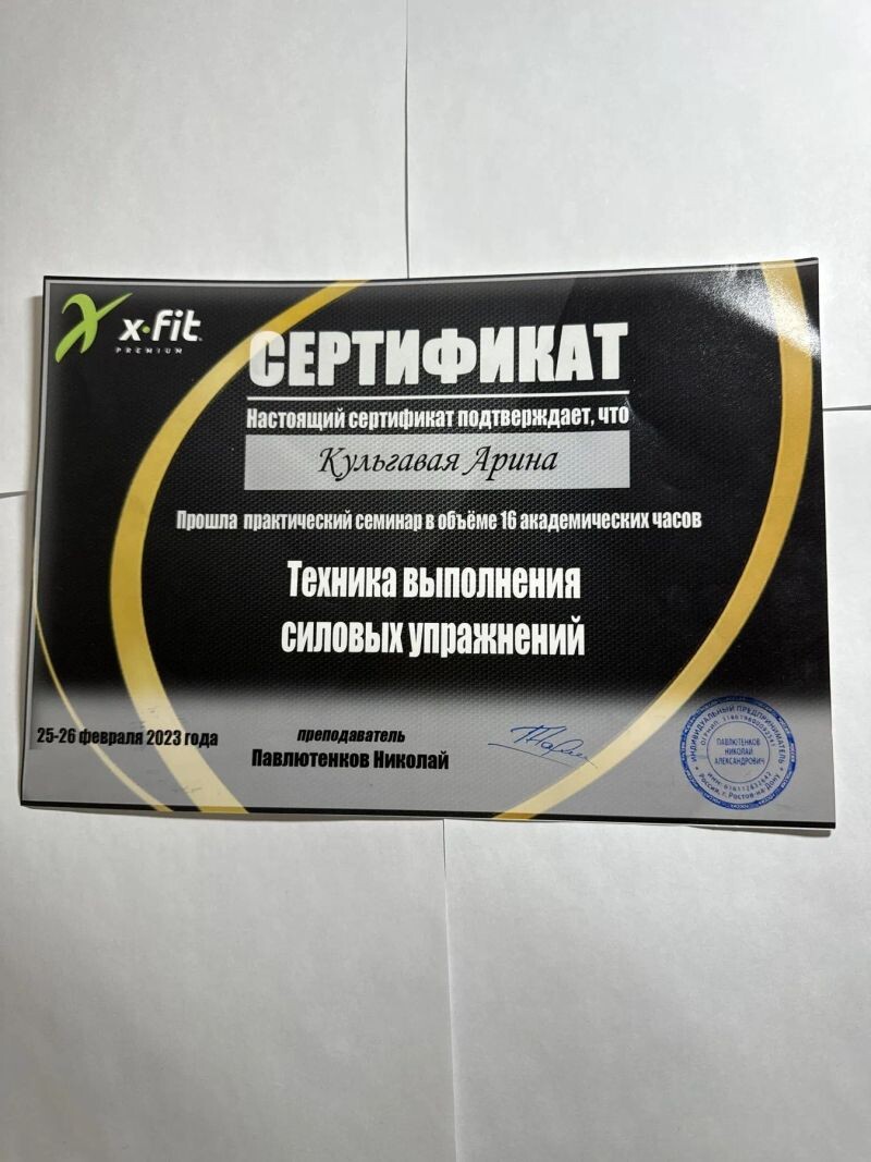 - Сертификат семинара «техника выполнения силовых упражнений» (с 2023 г.).