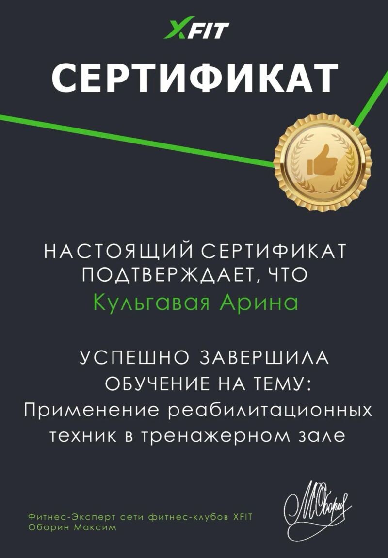 - Сертификат о прохождении обучения на тему: «Применение реабилитационных техник в тренажерном зале» (с 2023 г.).
