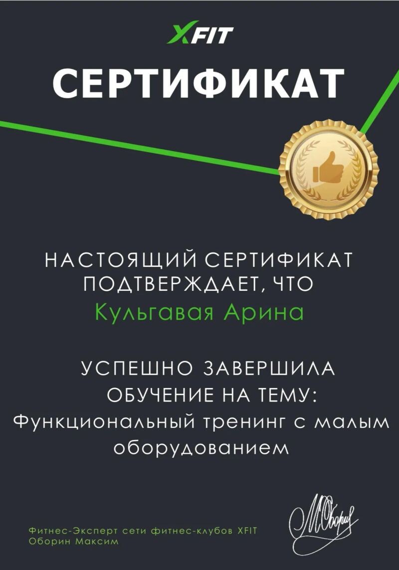 - Сертификат о прохождении обучения на тему: «Функциональный тренинг с малым оборудованием» (с 2023 г.).
