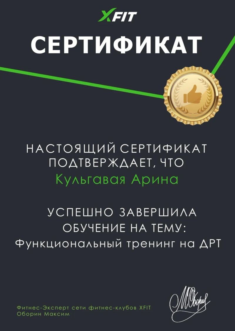 - Сертификат о прохождении обучения на тему: «Функциональный тренинг на ДРТ» (с 2023 г.).