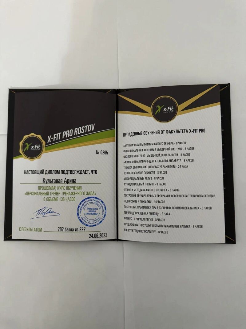 - Диплом о прохождении курса «персональный тренер тренажерного зала» в объеме 136 часов (с 2023 г.).