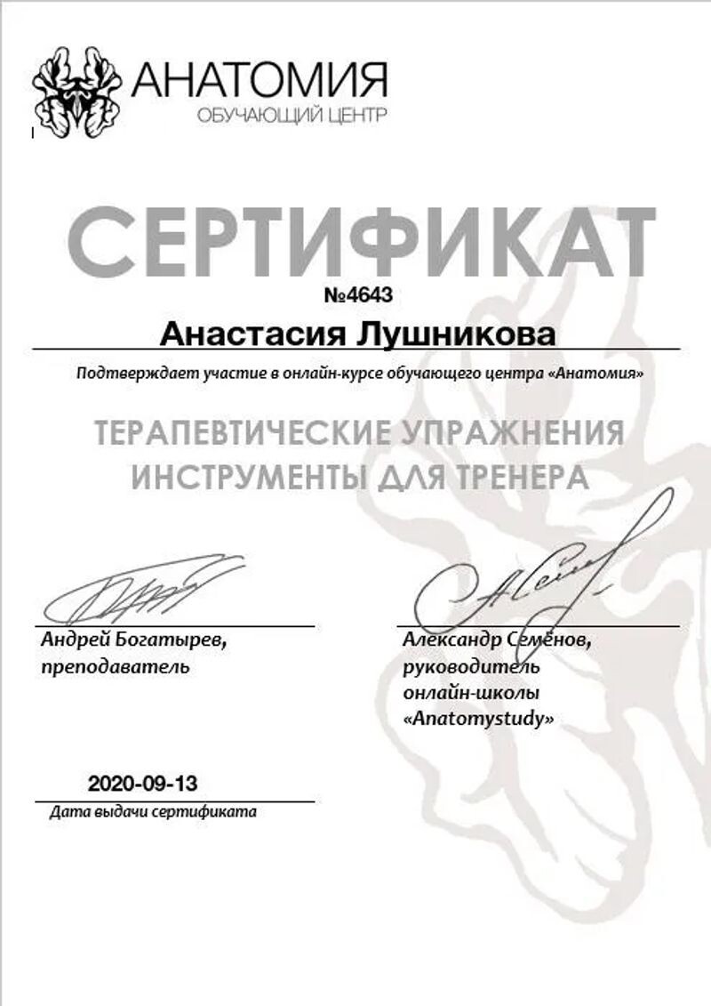 - Обучающий центр «Анатомия», курс «Терапевтические упражнения. Инструменты для тренера», 2020 г.