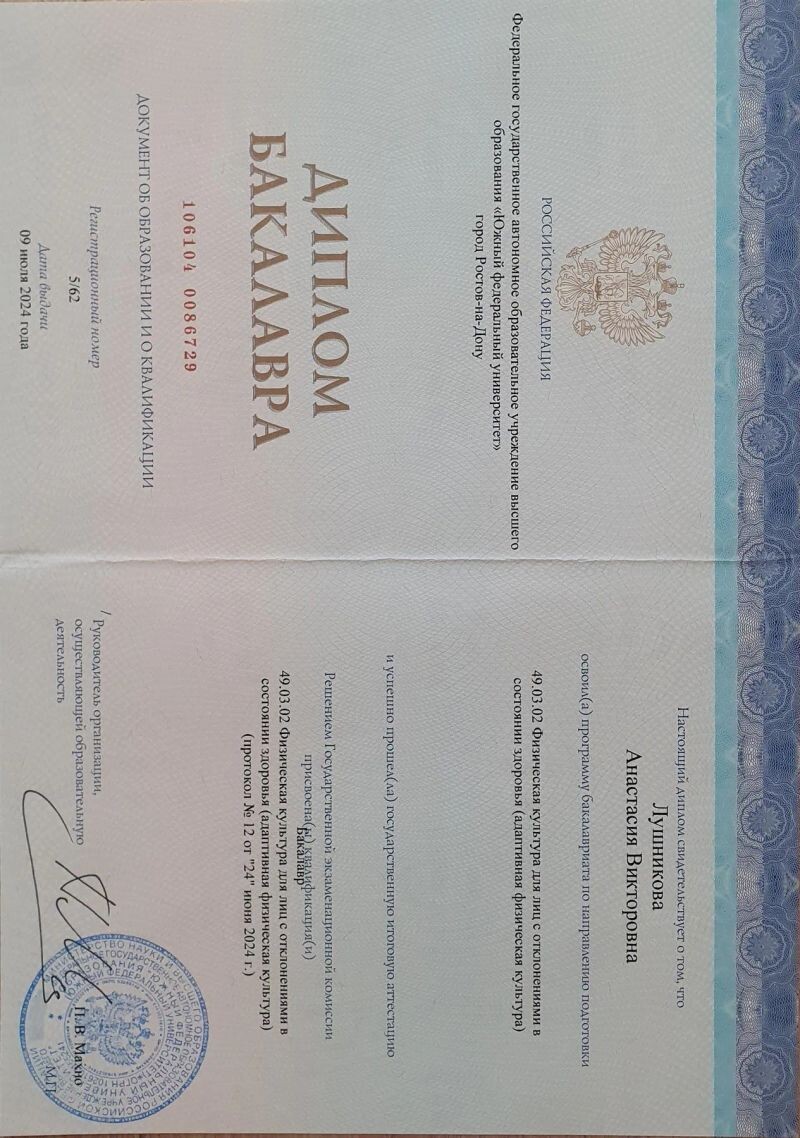 - Южный федеральный университет, физическая культура для лиц с отклонениями в состоянии здоровья (адаптивная физическая культура), бакалавр, 2019–2024 гг.