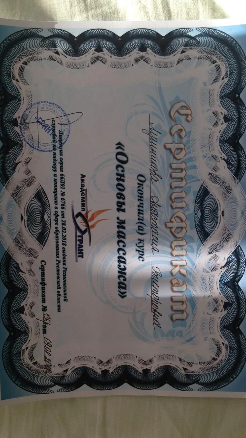 - Академия «Грант», курс «Основы массажа», 2018 г.