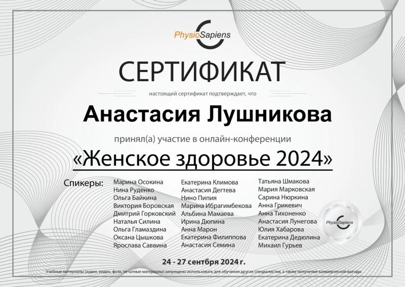 - PhysioSapiens, онлайн-конференция «Женское здоровье», 2024 г.