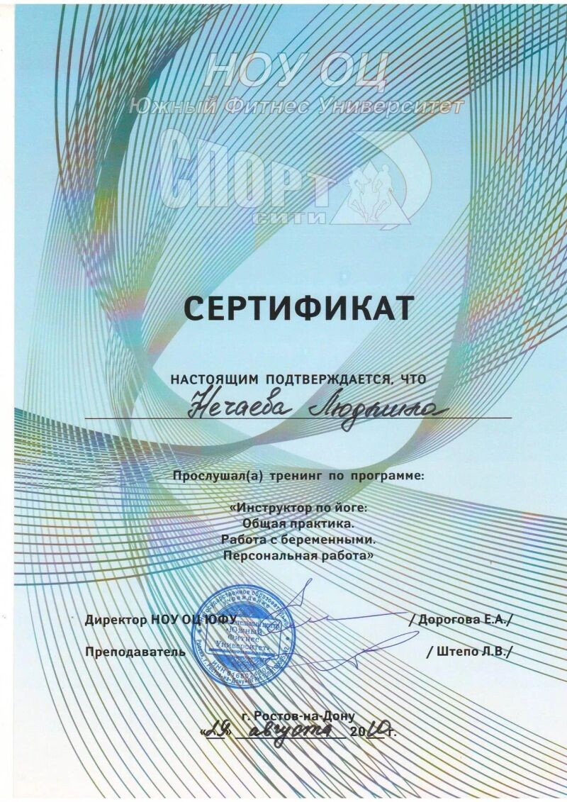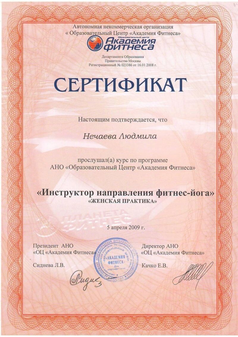 - Академия фитнеса, фитнес-йога, уровень I, 2008 г.