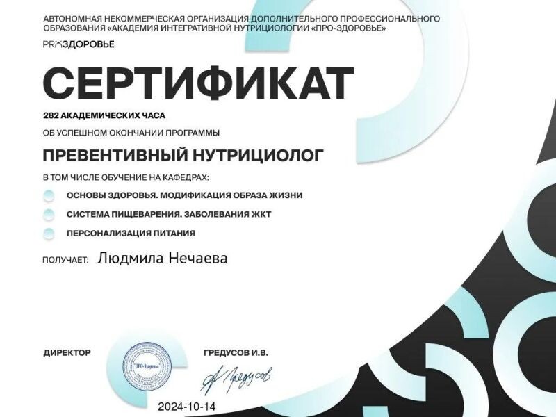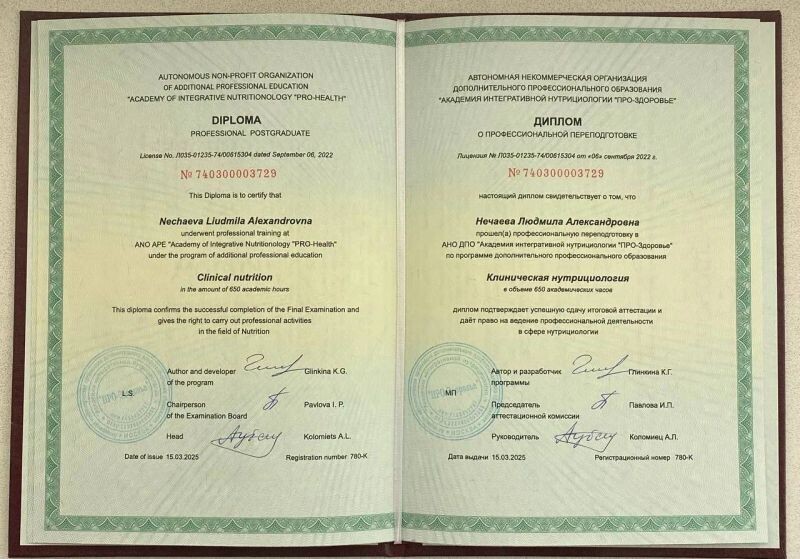 - Академия интегративной нутрициологии «ПРО-ЗДОРОВЬЕ», программа «Превентивный нутрициолог», 2024 г.