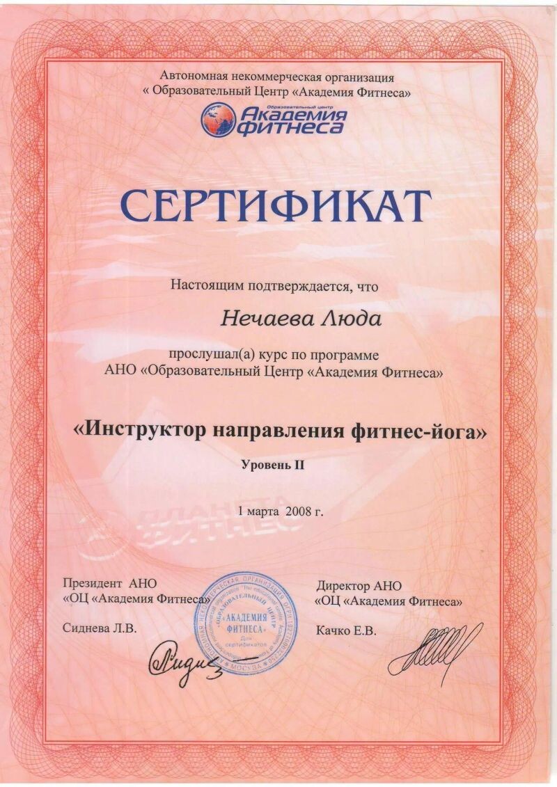 - Академия фитнеса, фитнес-йога, уровень II, 2008 г.
