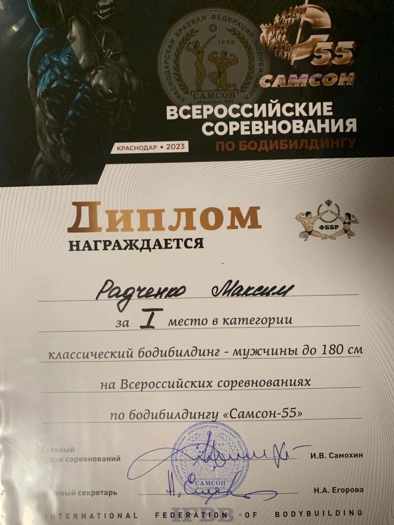 - Всероссийские соревнования по бодибилдингу «Самсон-55», I место в категории «Классический бодибилдинг», 2023 г.