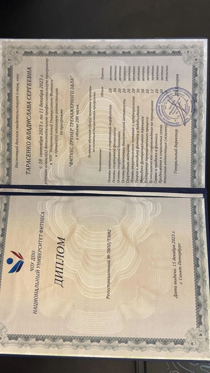- ЧОУ ДПО «Национальный университет фитнеса», фитнес-тренер тренажёрного зала, 2023 г.