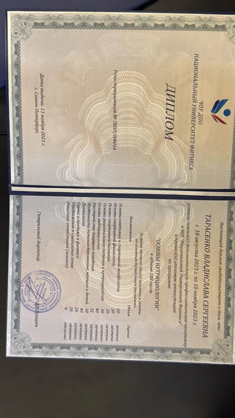 - ЧОУ ДПО «Национальный университет фитнеса», программа «Основы нутрициологии», 2023 г.
