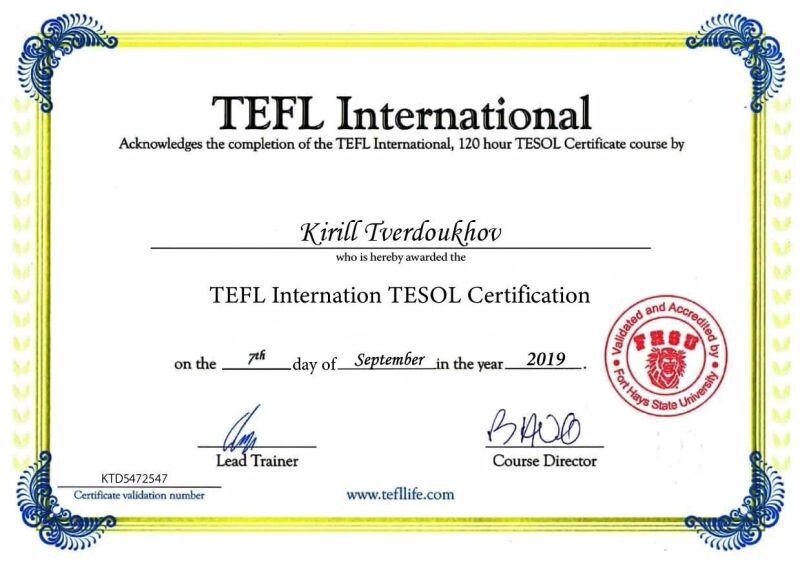 - TEFL Teaching English as a Foreign Language Certification, 2019 г.