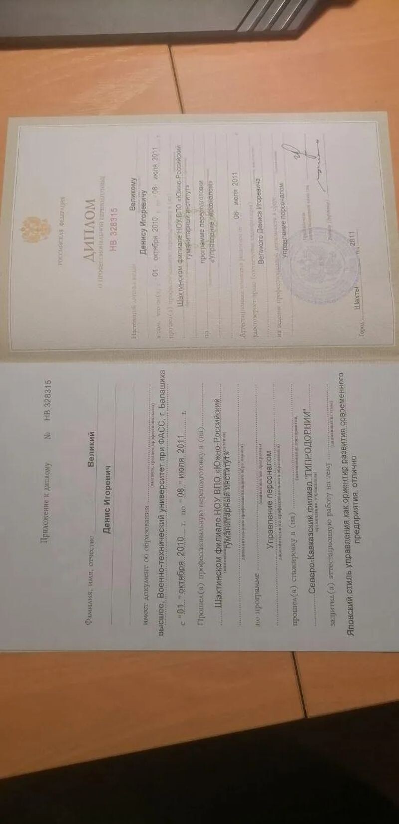- Шахтинский филиал НОУ ВПО «Южно-Российский гуманитарный институт», программа переподготовки «Управление персоналом», 2010–2011 гг.
