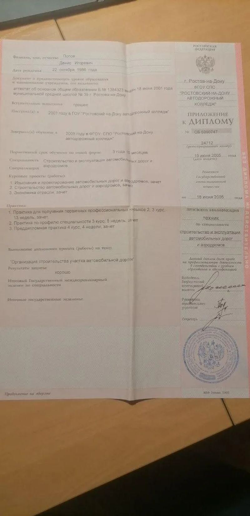 - ФГОУ СПО «Ростовский-на-Дону автодорожный колледж», техник, 2001–2005 гг.