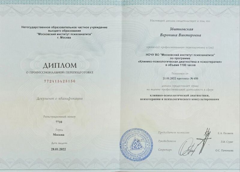 - Московский институт психоанализа, программа «Клинико-психологическая диагностика и психотерапия» с правом на ведение профессиональной деятельности в сфере клинико-психологической диагностики, психотерапии и психологического консультирования, 2021–2022 гг.