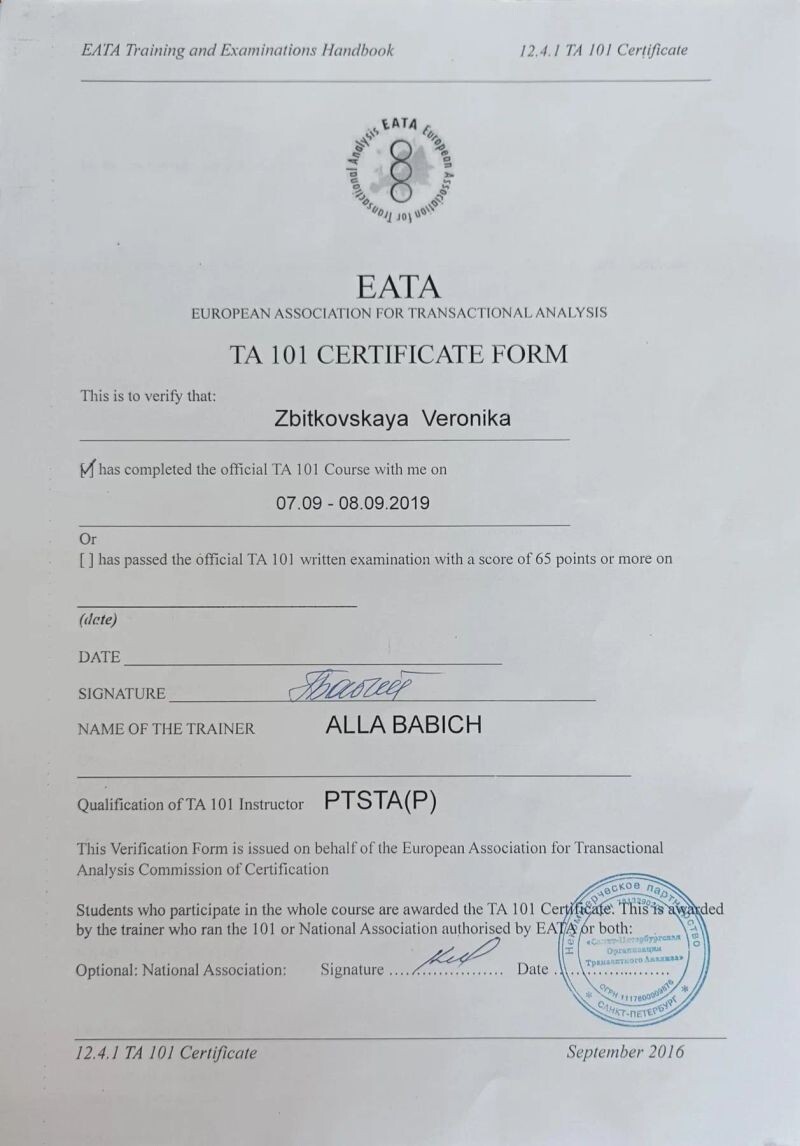 - European association for transactional analysis, курс ТА 101, 2019 г.