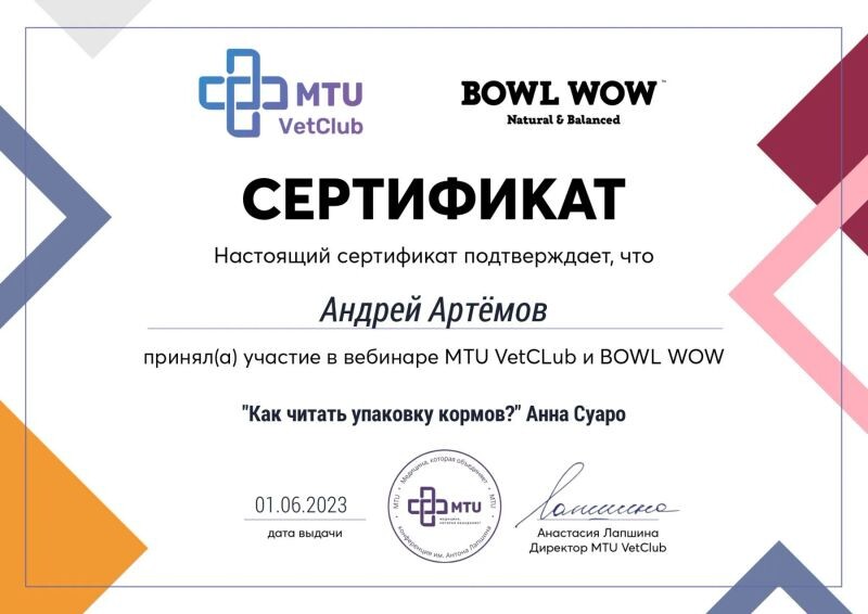 - MTU VetClub, вебинар «MTU VetClub и BOWL WOW как читать упаковку кормов?», 2023 г.