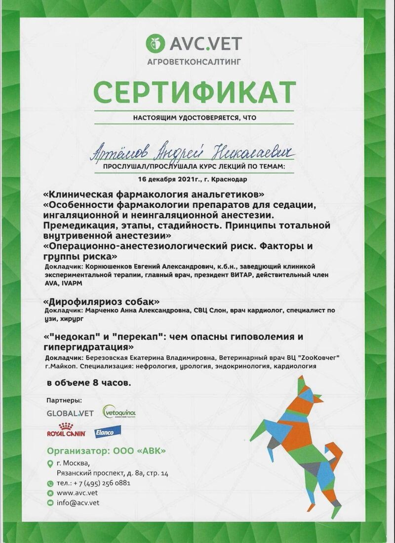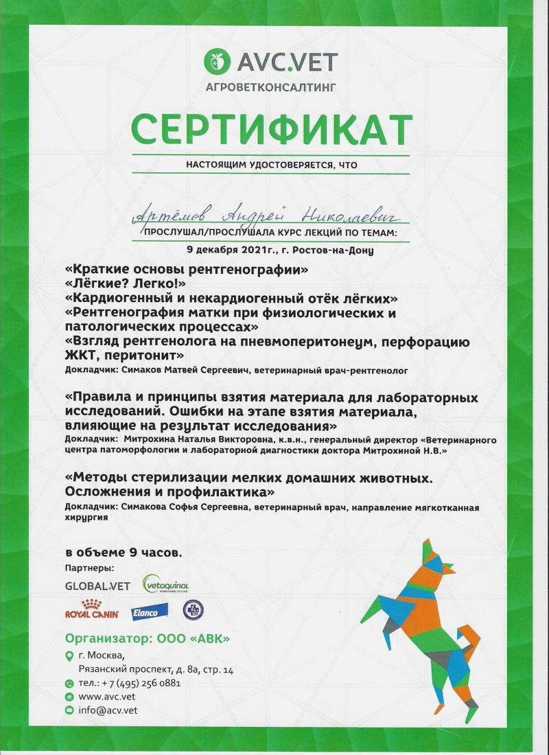 - XVI Сочинский ветеринарный фестиваль, курс лекций, 2021 г.
