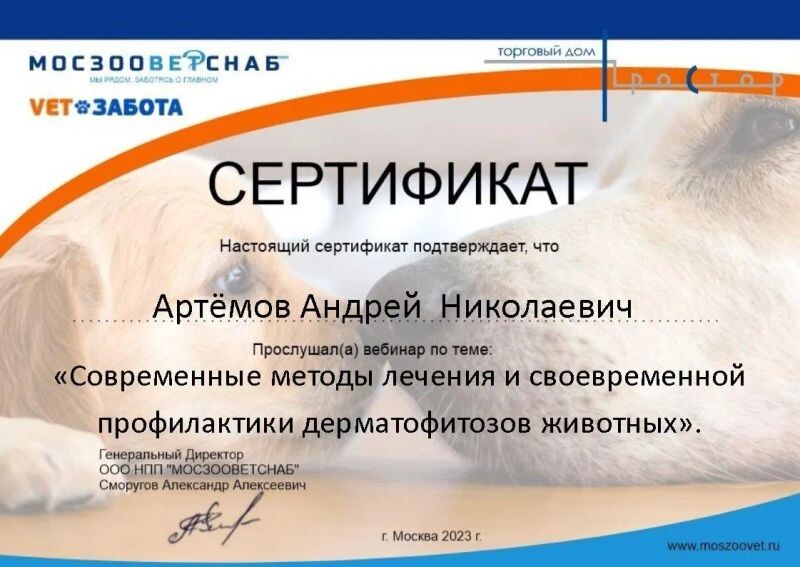 - ООО НПП «МОСЗООВЕТСНАБ», вебинар «Современные методы лечения и своевременной профилактики дерматофитозов животных», 2023 г.