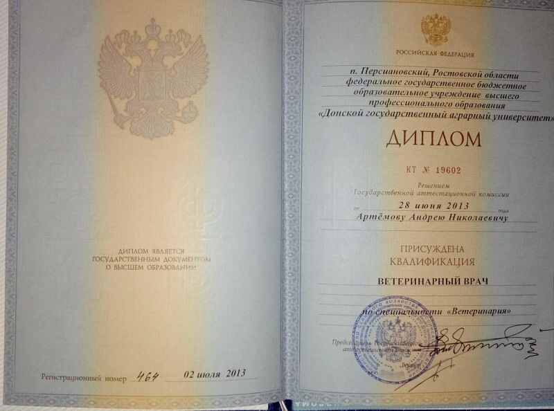 - ФГБОУ ВПО «Донской государственный аграрный университет», ветеринарный врач, 2008 г.