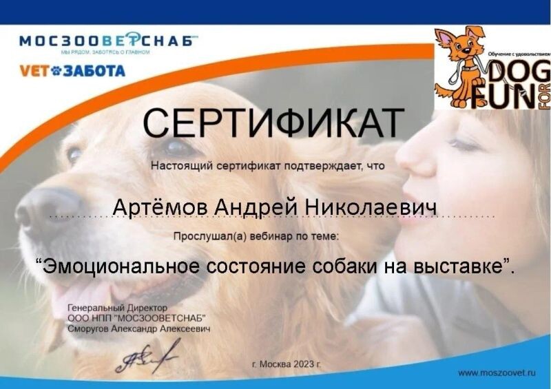 - ООО НПП «МОСЗООВЕТСНАБ», вебинар «Эмоциональное состояние собаки на выставке», 2023 г.