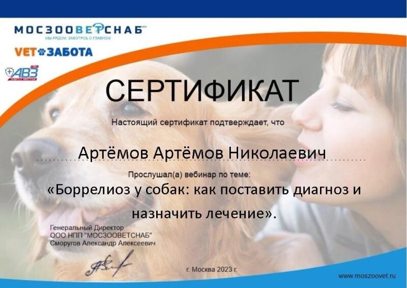 - ООО НПП «МОСЗООВЕТСНАБ», вебинар «Боррелиоз у собак: как поставить диагноз и назначить лечение», 2023 г.