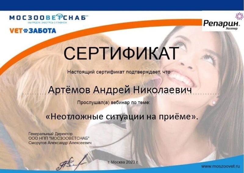 - ООО НПП «МОСЗООВЕТСНАБ», вебинар «Неотложные ситуации на приёме», 2023 г.