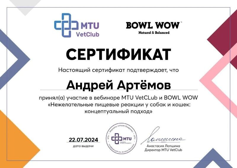 - MTU VetCLub, вебинар «Нежелательные пищевые реакции у собак и кошек: концептуальный подход», 2024 г.