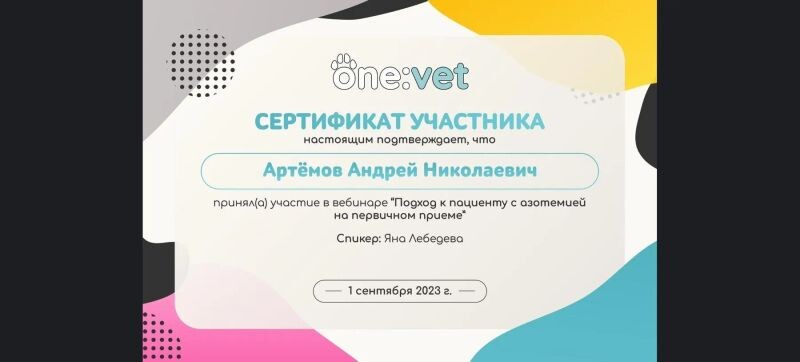 - ONE:VET, вебинар «Подход к пациенту с азотемией на первичном приёме», 2023 г.
