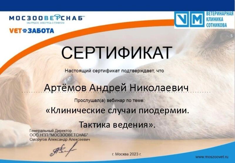 - ООО НПП «МОСЗООВЕТСНАБ», вебинар «Клинические случаи пиодермии. Тактика ведения», 2023 г.