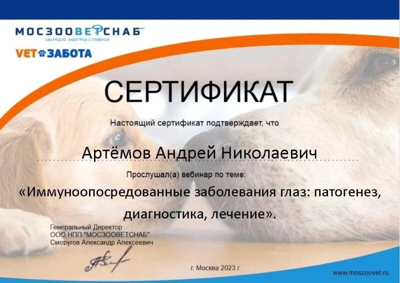 - ООО НПП «МОСЗООВЕТСНАБ», вебинар «Иммуноопосредованные заболевания глаз: патогенез, диагностика, лечение», 2023 г.