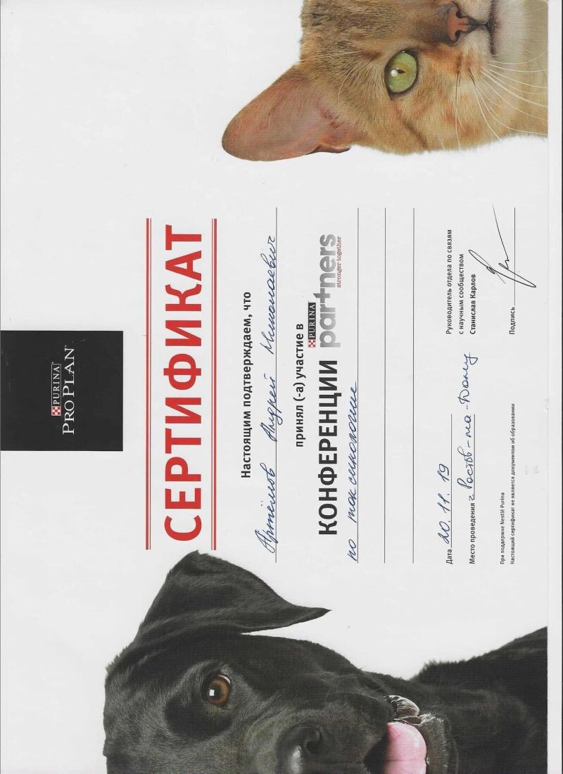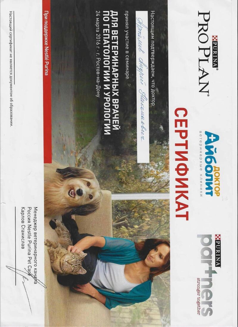 - Nestle Purina, семинар «Для ветеринарных врачей по гепатологии и урологии», 2016 г.